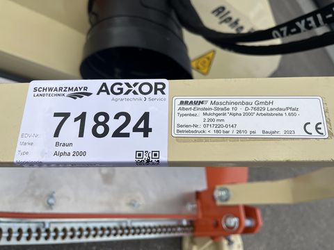 EDV: 71824 Das Mulchgerät der Marke Braun, Modell Alpha 2000, Baujahr 2023, bietet innovative Lösungen für die effiziente Bodenbearbeitung. Mit einer Arbeitsbreite von 1.650–2.200 mm ist der Mulcher ideal zur Anpassung an unterschiedliche Gassenbreiten geeignet. Die Arbeitsbreite ist stufenlos hydraulisch verstellbar, was maximale Flexibilität gewährleistet. Der Alpha 2000 ist als Front und Heckgerät verwendbar Front: https://youtu.be/4P9ozpHN4Gw?si=i3HjO5PF03ejVLir Heck: Besonders hervorzuheben ist der verwindungssteife Grundrahmen mit wartungsfreien und präzise gelagerten Seitenteilen, die dem Alpha 2000 eine robuste und langlebige Konstruktion verleihen. Die sich in einer Ebene überschneidenden Messer sorgen für einen effizienten Schnitt, während die Gelenkwelle mit Rutschkupplung und Freilauf und die hydraulische Seitenverstellung die Bedienung erleichtern. Mit einer Breite von 160cm - 200 cm, 0 Betriebsstunden und der Zustandsklasse 1 (besonders gut) ist dieses Gerät praktisch neuwertig. Zur Ausstattung gehören außerdem Räder zur Tiefenführung und Walzen, die eine optimale Bodenanpassung ermöglichen. Ein weiteres Highlight sind die integrierten Geräteaufnahmetaschen (50 x 50 mm), die die Montage weiterer Geräte wie Rebstammputzer oder Punktspritzen ermöglichen und damit zusätzliche Arbeitsgänge in einem Durchgang erlauben. Das Mulchgerät befindet sich am Standort der AGXOR Vertriebsgesellschaft Ost GmbH, Zweigniederlassung in der Wienerstraße 27, 7161 St. Andrä am Zicksee. Das Verkaufsteam der Fa. Agxor zeigt Ihnen das Gerät/Maschine gerne und bittet um Terminabsprache zwecks Besichtigung bei uns am Betrieb. Gerne unterbreiten wir auch ein Angebot per Mail. Wir freuen uns auf einen Besuch oder auf eine Anfrage.Kontaktdaten: