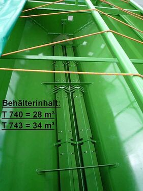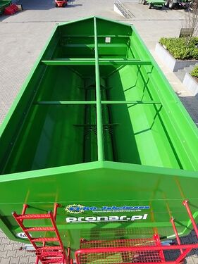 NEUMASCHINE: PRONAR Tandem-Überladewagen T 740 Technische Daten: Zul. Gesamtgewicht 23000 kg Eigengewicht 7700 kg Nutzlast 15300 kg Ladevolumen 28 m³ Pritsche innen LxB 6015 mm x 2492 mm Gesamtmaße LxBxH 9142/2960/3645 mm Bordwand 1440 mm + 340 mm Wandstärke (Boden/Bordwand/Aufsatz) 4/4/3 mm Spurweite 2260 mm Parabelfederung Deichselaugetragkraft 3000 kg Geschwindigkeit 40 km/h Durchmesser Entladeschnecke 430 mm Länge Entladeschnecke 5170 mm Entladeleistung ca. 200 - 400 m³/Std. Zapfwellendrehzahl 1000 U/min Austraghöhe 4550 - 4850 mm Bereifung 700/50 - 26,5 Serienmäßige Ausstattung: Automatische Überlastkupplung 1 3/4" Z=20 Doppelte Förderschnecke mit zwei Geschwindigkeiten Tandem-Fahrwerk mit Parabelfederung Achsabstand 1810 mm Hintere Nachlaufachse Hydraulische Achssperrung bei Rückwärtsfahrt Trommelbremsen 406 x 140 mm Stahlbordwände mit vertikalen Verstärkungen Überladeschnecke mit hydraulischer Bedienung Untenanhängung Aufstiegsleiter mit Podest an der Rückseite Teleskopschrägstützfuß mit Getriebe 2-Leiter-Druckluftbremse Keile mit Halter Kurbelbremse LED-Beleuchtungsanlage Metall-Kotflügel über beide Achsen Rahmen rot RAL 3000 Aufbau grün RAL6010 Gegen Mehrpreis auf Anfrage: Kugelkopfanhängung K 80 ALB-Regler 6-Punkt-Wiegeeinrichtung Rollplane Bereifung 600/55-26,5 Bereifung 600/55R26,5 Bereifung 700/50-26,5 Bereifung 710/50R26,5 TÜV-Gutachten Anlieferung und Finanzierung gegen Mehrpreis möglich.Kontaktdaten: