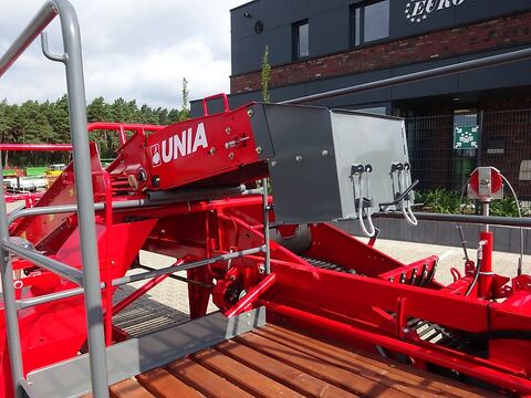 UNIA-Vollernter Bolko, Jetzt auch mit Lenkachse verfügbar! Bolko S, mit Plattform EUR 33.880,-- zzgl. Mwst = EUR 40.317,20 Bolko R mit Rollbodenbunker EUR 41.360,-- zzgl. Mwst = EUR 49.218,40 Einreihiger Kartoffelvollernter mit hydraulisch angetriebenem Rollbodenbunker (Inhalt ca. 1250 kg, Überladehöhe ca. 2500 mm) und Seitenaufnahme für kleine und mittlere Betriebe. Verlesetisch mit einseitiger Plattform und Steinsammelkasten, Krautzupfwalze, hydraulische Deichselverstellung, Gelenkwelle, Beleuchtung. Bedienung über Handsteuergerät. Hydraulikanschluss: EW + Rücklauf. Reihenweite 625 - 750 mm, Siebbandbreite 650 mm, Maschinenlänge ca. 5950 mm, Maschinenbreite ca. 2450 mm, Maschinenhöhe ca. 2550 mm, Bereifung 10.0/75-15.3, Gewicht ca. 1800 kg. Finanzierung und Anlieferung gegen Mehrpreis möglichKontaktdaten: