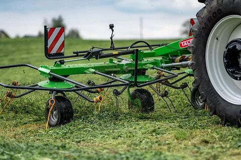 Der TORNADO 550 Zettwender ist eine Maschine mit vier Rotoren, die für ein effizientes Zettwenden von Stroh und Heu entwickelt wurde, um den Trocknungsprozess der Masse zu beschleunigen und Nährstoffverluste zu reduzieren. Merkmale des TORNADO 550 Zettwenders: 1. gezogene Version -Schnelles Ankuppeln der Maschine an den Traktor, -Geringer Leistungsbedarf (ab 35 PS) 2. Antriebsgetriebe von der italienischen Firma COMER/STAROSIELSKI -Fünf Zahnräder, das Hauptgetriebe in Öl, die anderen vier mit Fett geschmiert, mit Überdrehschutz 3. Zettwenderzinken -aus Draht mit 10 mm Durchmesser 4. hydraulische Zylinder zum bequemen Ein- und Ausklappen der Maschine, alles von einer Sektion aus gesteuert 5. Arbeitswinkelverstellung -Mechanische Einstellung des Arbeitswinkels für eine präzise Positionierung der Zinken 6. Radverstellung für die Arbeit an den Rändern der Wiesen 7. zapfwelle -460 Nm l-1600-Rasterkupplung 8. Rotoren -Vier sechsarmige Rotoren STANDARDAUSRÜSTUNG ZAPFWELLE, WINKELVERSTELLUNG, ANHÄNGEVORRICHTUNG, MECHANISCHE UND HYDRAULISCHE ZYLINDER Typ des Zettwenders -PRZ-550 -Arbeitsbreite -5,50m -Leistungsbedarf (hp) -35 -Anzahl der Kreisel -4 -Zapfwellendrehzahl (U/min) -540 -Gewicht -723 Kg -Kraftübertragungswelle -460 Nm; L-1600 -Erforderliche Anzahl von hydraulischen Anschlüssen -2 Großhandel mit Landmaschinen Zabielski Wir sind seit 2001 auf dem Markt tätig. //////////////////////////////////////////////////////////////////////////////////////////////////////////////////////////////////////////// Przetrząsacz TORNADO 550 to czterowirnikowa maszyna, która przeznaczona jest do efektywnego przetrząsania słomy oraz siana, przyśpieszając tym samym proces schnięcia masy i ograniczający ubytki składników odżywczych. Charakterystyka przetrząsacza TORNADO 550: 1. Wersja ciągana -szybka agregacja maszyny z ciągnikiem, -niskie zapotrzebowanie mocy (od 35 KM) 2. Przekładnie napędowe wykonane przez włoską firmę COMER/STAROSIELSKI -pięć przekładni z czego główna pracująca w oleju, pozostałe cztery smarowane smarem stałym posiadające zabezpieczenie zapobiegające nawijaniu się traw 3. Palce przetrząsacza -wykonane z drutu o średnicy 10 mm 4. Siłowniki hydrauliczne pozwalają na wygodne złożenie i rozłożenie maszyny sterowanie całością odbywa się z jednej sekcji 5. Regulacja kąta pracy -mechaniczna regulacja kąta pracy pozwalająca precyzyjnie ustawić pozycję zębów 6. Regulacja kół pozwalająca na pracę maszyny przy skrajach łąk 7. Wałek WOM -460 Nm l-1600 sprzęgło zapadkowe 8. Wirniki -cztery sześcioramienne wirniki WYPOSAŻENIE STANDARDOWE: WAŁEK WOM, REGULACJĄ KĄTA PRACY, ZACZEP, MECHANICZNA, SIŁOWNIKI HYDRAULICZNE Typ przetrząsacza -PRZ-550 -Szerokość robocza -5,50m -Zapotrzebowanie mocy (KM) -35 -Ilość wirników -4 -Prędkość obrotowa WOM (obr/min) -540 -Masa -723 Kg -Wał przekaźnika mocy -460 Nm; L-1600 -Wymagana ilość przyłączy hydraulicznych -2 Hurtownia maszyn rolniczych Zabielski Jesteśmy na rynku od 2001 r. ....................................................................................................................... The TORNADO 550 tedder is a four-rotor machine that is efficient for straw and hay tedding, accelerating the same drying process and reducing nutrient losses. Characteristics of the TORNADO 550 tedder: 1. Pulled version - fast aggregation of machines with a tractor, - low power demand (from 35 HP) 2. Transmission gears made by the Italian company COMER / STAROSIELSKI - five gears, the main one working in oil, the other four lubricated with grease, used with protection against winding grass 3. Tedder fingers - made with 10 mm wire 4. Hydraulic cylinders that support convenient folding and unfolding of the entire machine control are used on one side 5. Working angle adjustment -mechanical adjustment of the working angles allowing precise precise positioning of the teeth 6. Adjustment of wheels allowing machines to work at the edges of meadows 7. PTO shaft -460 Nm l-1600 ratchet clutch 8. Rotors - four six-pointed rotors STANDARD EQUIPMENT: PTO SHAFT, WORKING ANGLE ADJUSTMENT, HITCH, MECHANICAL, HYDRAULIC ACTUATORS Tedder type -PRZ-550 -Working width -5.50m -Power demand (KM) -35 -Number of rotors -4 PTO shaft speed (rpm) -540 -Mass -723 Kg -Power relay shaft -460 Nm; L-1600 -Number of hydraulic connections required -2 Agricultural machinery wholesaler Zabielski ------------------------------------------------------------------------- La henificadora TORNADO 550 es una máquina de cuatro rotores diseñada para la henificación eficaz de paja y heno, acelerando así el proceso de secado y reduciendo la pérdida de nutrientes. Características de la henificadora TORNADO 550: 1. Versión de tracción -Agregación rápida de la máquina con el tractor, -baja demanda de energía (a partir de 35 HP) 2. Engranajes de accionamiento de la empresa italiana COMER / STAROSIELSKI - cinco marchas, de las cuales la principal funciona en aceite, las otras cuatro están lubricadas con grasa con protección que evita que la hierba se enrolle 3. Henificadoras - hecho de alambre con un diámetro de 10 mm 4. Los cilindros hidráulicos permiten plegar y desplegar cómodamente la máquina, todo el control se lleva a cabo desde una sección 5. Ajuste del ángulo de trabajo -El ajuste mecánico del ángulo de trabajo le permite establecer con precisión la posición de los dientes 6. Ajuste de ruedas permitiendo que la máquina trabaje en los bordes de los prados. 7. Eje de la TDF Embrague de trinquete de -460 Nm l-1600 8. Rotores -cuatro rotores de seis radios EQUIPAMIENTO ESTANDAR: EJE DE TDF, AJUSTE DEL ÁNGULO DE TRABAJO, ENGANCHE, CILINDROS MECÁNICOS, HIDRÁULICOS Henificadora tipo -PRZ-550 -Ancho de trabajo -5,50m -Demanda de energía (KM) -35 -Número de rotores -4 -Velocidad de rotación de la TDF (rpm) -540 -Peso -723 Kg -Eje del relé de potencia -460 Nm; L-1600 -Número de conexiones hidráulicas ne