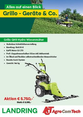 Honda GX270 OHV Anlassen Reversierstarter Versorgung Benzin Hubraum 270 cc, 1 Zylinder Leistung 8.4 HP (6.3 kW) Luftgekühlt Ölbad-Luftfilter Schlegelhäcksler 85cm Bereifung 16x6,50-8/4.008 Hydro Getriebe Der Grillo GH 9 ist ein hydrostatischer Schlegelmäher, welcher ideal ist zur Flächenreinigung von rustikalen Gebieten, zum Mähen hohem Gras und zum Schneiden von Buschwerk oder Laubschnittresten, auch an Hängen. Er ist ausgestattet mit einem geräusch- und vibrationsarmen Honda GX270 Einzylinder 276 cc , 8.4 PS (6.3 kW) Benzinmotor mit Luftfilter im Ölbad und Gusseisenzylindern. Die Reifen mit 16x6.50-8 haben Agrarbereifung. Dank der kompakten Ausmaße und der optimalen Gewichtsverteilung erweist sich der GH9 als wendige Maschine für den Einsatz in der Landwirtschaft sowie in der professionellen und privaten Grünpflege. Alle Steuervorrichtungen sind bequem erreichbar, der Lenkholm ist auf Schwingungsdämpfern aufgebaut. Das Getriebe ist hydrostatisch. Die stufenlos einstellbare Geschwindigkeit geht im Vorwärtsgang von 0 bis 6 km/h und im Rückwärtsgang von 0 bis 3 km/h. Der Lenkholm ist sowohl in der Höhe regulierbar, um ihn den Bedürfnissen des Bedieners anzupassen, als auch seitlich, um das Arbeiten unter niedrigen Zweigen oder Hindernissen zu begünstigen. Die Parkbremse wird durch ein Pedal bedient. Der Grillo GH 9 kann mit zweierlei Schlegemähern ausgestattet werden: einem mit 68 cm Betriebsbreite und 16 Paar „Y“-förmigen Messern und einem anderen vom 85 cm Betriebsbreite und 20 Paar „Y“-förmigen Messern. Sie sind in der Lage, Laub zu zerkleinern, Laubschnitt- und Pflanzenreste sowie Überreste am Ende der Gemüseernte zu zerkleinern. Bei beiden Modellen ist die Schnitthöheneinstellung stufenlos von 3 bis 11 cm mittels Kurbel einstellbar. Die Schnittöffnung des Schlegelmähers hat schwingende Paletten, um das Auswerfen von Rückständen zu vermeiden. Weiterhin wird eine Stütze mitgeliefert, mit welcher der Schlegelmäher für Wartungsarbeiten an der Schnittkammer angehoben werden kann.Kontaktdaten: