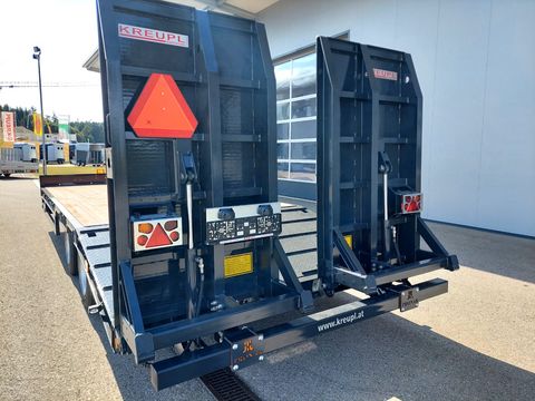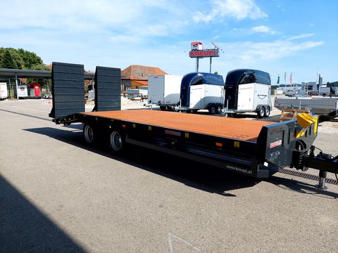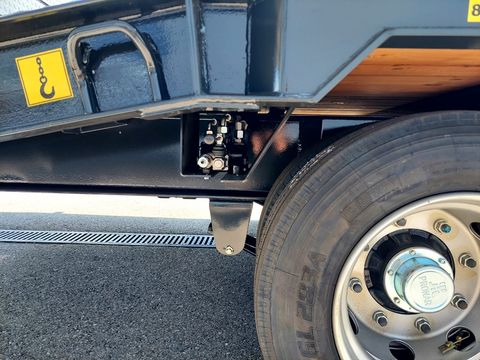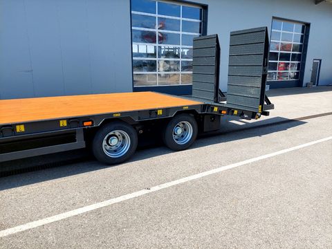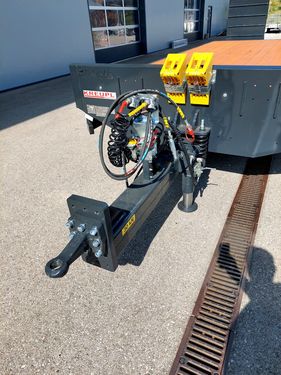 Technische Daten: Plattformlänge + Absenkung: 5500 + 1520 mm Plattformlänge (Gesamt): 7020 mm* Auffahrrampenlänge: 1900 mm Plattformbreite: 2540 mm** Gesamtmaße (L / B / H): 9450 / 2550 / 2460 mm Holzboden: Nadelholz (45 mm) Plattformhöhe: 930 mm Achsenhersteller: Pronar, Achsen: 2 Stk. Achslast: 8000 kg, Stützlast: 3000 kg Bremsanlage: 2-Leiter Druckluftbremse mit ALB Parabelfederung, Bereifung: 215/75 R17,5 Zurrringe: 10 Stk., erforderliche Schlepperleistung: 104 PS / 76,4 kW * Maße mit eingezogenen Auffahrrampen ** Anhänger für die Verbreiterung der Ladefläche nicht geeignet Grundausstattung: Gefederte Deichsel mit Untenanhängung und starrer Zugöse Ø40 Trommelbremse 300 x 135 mm, Kurbelbremse, hintere Stützfüße Seitliche Schutzeinrichtung, Zurringe für Ladungssicherung Elektroanlage 12V mit elektr. Anschluss hinten und seitl. LED-Umrissbeleuchtung (Rücklichter mit Schutzgitter) 2 Stk. Radkeile, Warndreieck Lackierung: Schwarzgrau (RAL 7021) Enthaltene Zusatzausstattung: *COC-Ausführung: 40 km/h-Zulassung gemäß EU-Verordnung Nr. 167/2013 Inkl. 2-Leiter-Druckluftbremse mit ALB, zul. GG: 16.000 kg, hinterer Unterfahrschutz *AT-Typengenehmigung *Hydraulischer Stützfuß *Innenverbreitung der Auffahrrampen (Innenabstand: 500 mm) *Hydraulische Auffahrrampen *WerkzeugkastenZul. Gesamtgewicht (t): 16