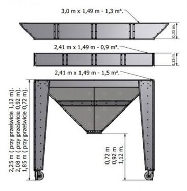 TOP ANGEBOT – Vielseitiger Trichter für effiziente Umschlagsarbeiten Der angebotene Trichter dient als praktischer Pufferbehälter bei Umladearbeiten und optimiert in Kombination mit einem Förderband und Lader das Be- und Entladen von Schüttgütern in Flachlagern erheblich. Zusätzlich kann der Trichter auch als Verpackungseinheit genutzt werden, was ihn zu einem vielseitigen Helfer im landwirtschaftlichen und industriellen Einsatz macht. Die Konstruktion besteht vollständig aus verzinktem Blech, wodurch sie witterungsbeständig und langlebig ist. Der Trichter steht auf vier stabilen Beinen, die mit Rädern ausgestattet sind – ideal zum Bewegen des leeren Behälters auf befestigten Flächen. Zusätzlich ist der Trichter mit Kufen ausgestattet, die einen einfachen Transport mit dem Gabelstapler ermöglichen und damit die innerbetriebliche Logistik erheblich erleichtern. Standardausstattung: Kegelvolumen: 1,5 m³ Räder für das manuelle Verschieben im Leerzustand Entladeöffnung: 20 x 20 cm mit Guillotine-Schieber zur dosierten Entleerung Abmessungen: 2,5 m Länge × 1,5 m Breite Höhe wählbar: zwischen 1,85 m und 2,25 m Verfügbare Optionen: Wandverlängerung um 25 cm (zusätzliches Volumen: +0,9 m³) Wandverlängerung um 33 cm (zusätzliches Volumen: +1,3 m³) Gabelstaplertaschen für noch einfacheren Transport Individuelle Sonderanfertigungen auf Anfrage Dieser Trichter ist ideal für Betriebe, die Wert auf Effizienz, Flexibilität und robuste Bauweise legen. Die durchdachte Konstruktion ermöglicht eine einfache Handhabung und vielseitige Einsatzmöglichkeiten. Kontaktieren Sie uns – wir beraten Sie gerne und garantieren marktweit beste Preise. ✦✦✦✦✦✦✦✦✦✦✦✦✦✦✦✦✦✦✦✦✦✦✦✦✦✦✦✦✦✦✦✦✦ EKOAGRI – Ihr zuverlässiger Partner für Landmaschinen Wir sind ein vertrauenswürdiger Geschäftspartner aus Polen und vertreiben seit über 10 Jahren hochwertige Landmaschinen in ganz Europa. Unser Service umfasst die Organisation von Transport, Kundendienst sowie Garantieabwicklung – alles aus einer Hand. Wir liefern zuverlässig in alle europäischen Länder und darüber hinaus weltweit. Möchten Sie sicher und erfolgreich investieren? Dann kontaktieren Sie EKOAGRI – wir beraten Sie gerne! ✦✦✦✦✦✦✦✦✦✦✦✦✦✦✦✦✦✦✦✦✦✦✦✦✦✦✦✦✦✦✦✦✦Kontaktdaten:
