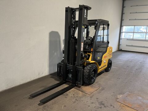 Bauart: Frontstapler / Dieselstapler, Tragkraft: 3000kg, Hubhöhe: 5500mm, Bauhöhe: 2435mm, Freihub: 1785mm, Gabellänge: 1200mm, Bereifung vorne: Superelastik Einfach Neu , Bereifung hinten: Superelastik Einfach Neu , Anbaugeräte: Seitenschieber, Sonderausstattung: 3. Ventil, 4. Ventil, Arbeitsscheinwerfer hinten, Arbeitsscheinwerfer vorn, Heizung, Russfilter, Vollkabine, Vollfreihub, CE Zertifikat, Waage, Innenspiegel, Joystick, Scheibenwischer, LED, Sitz,