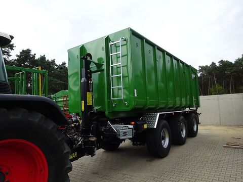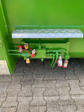 EURO-Jabelmann Container STE 6500/2300 mit Volumenklappe am Heck Inhalt ca 39 m³ mit Kornschieber z. B. für Pronar Containerfahrzeug T 286 / T 386 Aufnahmebeschläge für Hakensysteme nach DIN 30722-1 (15.000 kg) mit heckseitigen Außenrollen und Unterrahmen aus INP 180 Außenrollen abschmier- und wechselbar Aufnahmebügel Ø 50 mm , Hakenhöhe 1570 mm Bodenwanne aus 5 mm St 37.2 (S235JR) Seitenwände aus 3 mm St 37.2 (S235JR) Bodenwanne mit 250 mm Radius zur Seitenwand Abschlussprofil aus stabilem Rundrohr Ø 90 mm Spanten Abstand 750 mm Spanten Profil U 80 x 50 x 4 mm Behälterkorpus rundum durchgeschweißt Doppelflügeltür (Scharniere durch Schmiernippel abschmierbar), mit holl. Türverschluss und seitlichem Sicherheitszentralverschluss nach UVV Türverschluss mit Behältertür - Öffnungshilfe Umlaufend Plan- und Netzhaken Steigeisen nach UVV stirnseitig Behälter von innen einmal grundiert von außen doppelt grundiert und von außen doppelt einfarbig in RAL 6010 (Grasgrün) lackiert UVV-Aufkleber mit Sicherheitshinweisen Behälter geprüft und abgenommen nach BGR 186 Gewicht ca. 3095 kg Anlieferung gegen Mehrpreis möglich.Kontaktdaten: