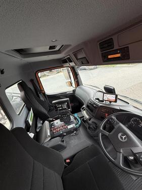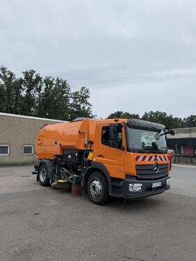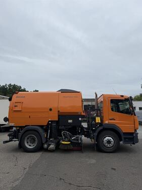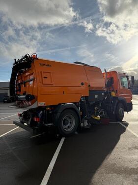 Erstzulassung: 24.10.2024 ________ Zwei-Motoren-Variante mit JCB55kW / Stufe 5 Doppelseitige Schmutzaufnahme, gezogen Grundausstattung Kehrmaschine Bedienelemente In der Kabinenmitte montiertes Hauptbedienpanel mit JVM zur Anzeige von Informationen zu einem breiten Spektrum an Kehrmaschinenfunktionen plus Download Möglichkeit für aufgezeichnete Daten. Ferner können am JVM Bildschirm die Bilder von bis zu vier Kameras angezeigt werden. Türseitig ist eine separate Bedienkonsole mit Handballenauflage zur Steuerung der Hauptkehrfunktionen montiert. Sauggebläse Variable Sauggeschwindigkeit von 1800 U/ min bis 3500 U/min zur Anpassung an unterschiedliche Einsatzbereiche. V65t: Höhere Getriebeübersetzung: 1.79:1 Tellerbesen (Rinnsteinbürste) Schnellwechsel-Besensystem mit variabler Kehrgeschwindigkeit bis zu 160 U/min (von der Kabine aus steuerbar). Gut sichtbarer signalgelber Besenteller und Schlauchführung. Saugmund Saugmund aus Aluminiumguss mit 250 mm Durchmesser am Einlass und werkzeugloser Einstellung. Staubunterdrückungssystem Sprühköpfe zur Staubbindung befinden sich an Saugdüse(n), Tellerbesen und entlang der Fahrzeugvorderseite. "Pressadrain" Wasserraufbereitungssystem. EUnited 4-Sterne-Zertifikat nach PM10. Elektrik 24 V Alle externen Kabelstranganschlüsse erfüllen die Vorschriften der Schutzklasse IP67. Außengeräusch / Schallleistungspegel LWA 108 dB(A) für Motoren mit Standardleistung, gemessen nach EG-Richtlinie 2000/14/EG. LWA 112 dB(A) für Hochleistungsmotoren, gemessen nach EG-Richtlinie 2000/14/EG. Kehrgutbehälter Der Aufbau besteht aus Kehrgutbehälter und integriertem Wassertank. Hergestellt aus hochgradig belastbarem Inox-Stahl. Wasserdichtes Hecktürverriegelungssystem mit Sicherheitsschloss und Entwässerungsfunktion. Zwei seitliche Wartungstüren und seitliche Staufächer. Ein Wassersieb ermöglicht die Verwendung des Kehrgutbehälters als großen Wassertank zum Straßenspülen. Heckentladeklappe, automatische mehrstufige Kehrgutbehälterstütze, zwei geschützte Rundumleuchten hinten und LED Arbeitsscheinwerfer zählen zur Standardausstattung. Behältervolumen*** 6.5 m³ Auskippwinkel 54° (Nennwert) Türöffnungswinkel 125° (Nennwert) Wassertank Der mit Schwappschutz ausgestattete Wassertank kann über einen Hydranten vom Typ 'A' befüllt werden. Die Doppelmembranpumpe ist für Dauerbetrieb und sogar Trockenlauf geeignet. Wasservolumen 1545 l (optional 2000 l) Ablufthaube Die glattflächige Ablufthaube ist mit einer frequenzspezifisch abgestimmten Schalldämmung ausgekleidet. Besen Walzenbesen Ø 406 mm Breite Walzenbesen 1275 mm Breite Saugmund 750 mm Tellerbesen 500 mm (opt. Ø 650 mm) Sonderausstattung Kehrmaschine - Aufbaumotor: JCB 55kW turbogeladen schadstoffarm nach Stufe 5, ERFORDERT EN590 (oder ähnlich) SCHWEFELARME KRAFTSTOFFE - Ausrichtung der Kehraggregate in Rechtsausführung - Endmontiert auf beizustellenden MB Atego 1324 - Luftführungssieb im Schmutzbehälter pneumatisch Heben und Senken - Rüttelvorrichtung für Luftführungssieb pneumatisch betätigt - Kettenvorhang im Schmutzbehälter vor dem Luftführungssieb - Wassertank Anschluss Kupplung Typ A, Storz 2 1/2 Zoll - Schmutzwasser-Ablaßsieb mit abgestufter Perforation, an der Heckklappe angebracht, ermöglicht eine effizientere Entwässerung des Schmutzraumes ( siehe PI611) - Montagerahmen an der Heckklappe für Anbau von zusätzlichem Equipment - Zusätzliche Sprühdüsen an der Saugmundrückseite (Nicht verfügbar mit Combivak-Saugmund PI611) - Autolock-System Pneumatisches Verriegelungssystem Verhindert ein Absinken der Kehraggregate bei Luftverlust des Fahrgestells - Verstärkte Stützräder und Lager für Zwischenachs-Flächensaugmund - Powasave Auflagedruckregelung für den Tellerbesen, mit Manometer (Bei doppelseitig aufnehmenden Maschinen mit unabhängiger Steuerungen) - Verstellung Besenneigung Tellerbesen über Joystick, doppelseitig - Simultanes Kehren beidseitig gleichzeitiges Kehren - Variabrush Tellerbesen stufenlos ein- und ausfahren, doppelte Schmutzaufnahme - Stufenlose Drehzahlregulierung des Walzenbesens - Beschichteter Saugstutzen Saugrohr und verstärktes Prallblech, gummiert - Tellerbesen Ø 650 mm Stahlbesatz - Walzenbesen Ø 406 mm mit einteiligem Kunststoffbesatz - Zusätzlicher Niederdruck-Sprühbalken vor dem Walzenbesen gezogen - Saugschlauchausleger heckseitig Ø 200 mm, mit hydraulischer Entlastung und Steuereinheit am Haltegriff sowie Verlängerung - Zugseil für Ausleger - Easiclean zur einfacheren Reinigung des Schmutzbehälters innen - Spüleinrichtung zur Ventilatorreinigung - Seitliche Hochdruckdüse am Saugmund, einseitig zur intensiven Reinigung hinter dem Tellerbesen (nur erhältlich mit vollem Supawash-System) - Manuelle Wasserhandventile im Fahrerhaus - Werksausführung - Supawash Option 3 Hochdruck-Waschanlage (100 bar / 30 L/min) mit Handlanze und Schlauchhaspel (15 m Schlauch), Düsenleiste am Walzenbesen und am Saugmund, (Nicht lieferbar für V65e oder mit Combivak-Düse, siehe PI611) - zwei LED-Rundumkennleuchten orange, am Heck - drei Arbeitsscheinwerfer LED weiß (beidseitige Aufnahme) - Umrissleuchten am Heck - Schlussleuchten versetzen - Länderpaket, beinhaltet: > Stoßeisen + Kupplungsschlüssel + Kennzeichenhalter > Wasserfüllschlauch 3 m > RKL vorne mittig u. hinten rechts > Seitenmarkierungsleuchten hinten rechts u. links > Aufstiegstritt hinten rechts (nicht bei Heckabsaugung) > Markierungsfolie ROT/WEISS DIN 30710 vorne und hinten Trägerfahrzeug LKW DB Atego 1324 Grundausstattung LKW Lackierung: - Fahrerhaus: MB 2603 tieforange Sonderausstattung: Achslastverteilung - Gewichtsvariante 15,0 T (5,1/10,5) Motor - Motor Om936, R6, 7,7 L, 175 KW (238 PS), 1000 NM - OM 936 - Motorausführung Euro VI, E - High Performance Engine Brake Kupplung & Getriebe - Getriebe 9S-1115 TD/12,73-1, ZF-Ecomid G5h Schaltung, Manuell Achsen & Aufhängung - Vorderachse, 5,3 T - Hinterachse, Tellerrad 390, Hypoid, 11,0 T - Differenzialsperre Hint