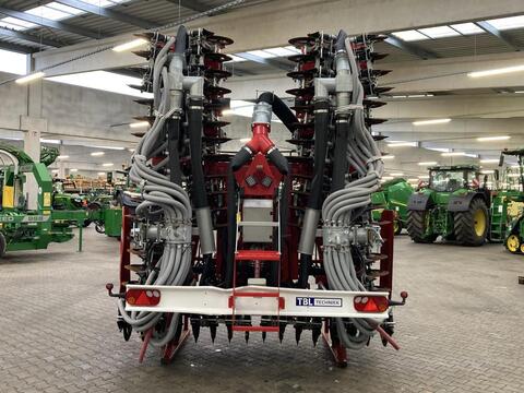 ________ TBL Scheibeninjektor, 13,5m Arbeitsbreite mit dicken Scheiben Rahmen: Scherenklappsystem mit Tragarm auf 9m Arbeitsbreite, geringes Eigengewicht Synchrones Ein- Ausklappen des Rahmens inkl. Transportverriegelung Rahmenaufhangung in einem zentralen Pendelbock, für optimale Bodenanpassung Pulverbeschichteter Rahmen Automatisch klappender Anfahrschutz für den Transport Rahmen inkl. Schnellwechselaufnahme Elemente: Sehr offene Rohrelement (weniger Gewicht) bereits mit 4 Scheiben pro Element bestückt. Spurfolgende Elemente, je Seite 10°. Einschlagwinkel hydraulische Hohenführung der Elemente, ca. 25cm Scheibendurchmesser 400mm, Scheibenabstand 18,75cm, Lagerung: Zweireihige Schragkugellager mit beidseitiger Dreifach-Abdichtung Alle Drehpunkte der verzinkten Elemente sind mit gehartetet Buchsen ausgestattet Sehr wartungsfreundliches Element Verzinkte Elemente Automatische Zentralschmierung 12V oder 24V LED-Beleuchtung und LED-Seitenmarkierungsleuchten Gewicht ca. 4100 kg Treppe zum Verteiler und zwei Abstellbocken 4 Verteiler, Alrena mit 40 mm Schlauchen Transporthohe: 3,5 Meter, Transportbreite: 2,99 Meter Zoll Schlauch zum Verteiler (4 Meter) Multifaster Injector seite Section Control mit 9 Sektionen: Das Schließen des Abschnitts ist vollhydraulisch (externe Leitungen für P, T und Ls müssen vorhanden sein) Wenn kein RTK-Signal vorhanden ist, kann immer weiter gearbeitet werden. Die drei außeren Sektionen werden beim Abschalten automatisch angehoben. Abschnittsbreite 9x1,5m Kamera mit geheiztem und extra gehärtetem Frontglas, 2x LED Arbeitsscheinwerfer,Kontaktdaten: