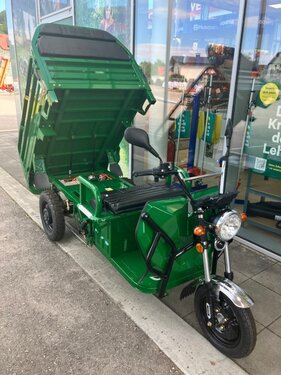 Kipper 3-seitig abklappbare Bordwände Lastengang STEIGFÄHIGKEIT: ca 20% REICHWEITE: bis zu 60 km ABMESSUNG L/B/H: 3010/1020/1400 mm LADEFLÄCHE L/B/H: 1410/925/300 mm MOTORLEISTUNG: 250W / 72V 60Ah (elektronisch begrenzt) BATTERIE: AGM - 6 Akku ZULADUNG: Bis zu 370 kg GESCHWINDIGKEIT: 25 km/h LDR-25, 25 km/h (Wichtig: In Österreich Straßenzulassung laut STVO als Fahrrad) STEIGFÄHIGKEIT: ca 20% REICHWEITE: bis zu 60 km ABMESSUNG L/B/H: 3010/1020/1400 mm LADEFLÄCHE L/B/H: 1410/925/300 mm MOTORLEISTUNG: 250W / 72V (elektronisch begrenzt) BATTERIE: AGM ZULADUNG: Bis zu 370 kg GESCHWINDIGKEIT: 25 km/h GRUNDAUSSTATTUNG Kipper 3-seitig abklappbare Bordwände LastengangKontaktdaten: