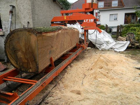 **Produktbeschreibung: Wood-Mizer LT15START Bandsäge** Die Wood-Mizer LT15START Bandsäge ist ein preisgünstiges Sägewerk, das sich ideal für alle eignet, die nicht viel Holz schneiden möchten, aber großen Wert auf exzellente Schnittqualität legen. Dieses Modell ist perfekt für den Einsatz mit Stämmen bis zu einem Durchmesser von 70 cm und bietet eine Standardlänge von 5,4 m, die bei Bedarf mit Zusatzausrüstung nahezu unbegrenzt verlängert werden kann. **Technische Details und Funktionen:** - **Motorleistung:** Die LT15START ist mit einem leistungsstarken 5,5 kW Elektromotor ausgestattet, wobei eine Option auf 7,5 kW besteht, um auch anspruchsvollere Schnittaufgaben zu bewältigen. - **Schnittkapazität:** Stämme mit einem Durchmesser von bis zu 70 cm können problemlos geschnitten werden. Die schmalen Sägebänder sind für verschiedene Holzarten geeignet. - **Stabilität und Präzision:** Drei Stammklemmen und sechs verstellbare Seitenstützen sorgen für sicheren Halt der Stämme während des Schneidens. Die Kopfhöhe lässt sich präzise durch eine Handkurbel einstellen. - **Effiziente Handhabung:** Das Sägeblatt wird durch leichtes Voranschieben des Sägekopfes durch den Stamm geführt. Nach jedem Schnitt wird der Kopf zurückgezogen und für den nächsten Schnitt neu positioniert. - **Bandschmierung und Stabilität:** Eine effektive Bandschmierung sorgt für Sauberkeit und Kühlung des Bands sowie für reduzierte Reibung. Der Bandführungsarm gewährleistet die Stabilität des Sägebandes, selbst bei unterschiedlich dicken Stämmen. Die Bandspannung ist einfach einstellbar. **Beliebtes Zubehör:** - **Laderampen:** Erleichtern das Heraufrollen der Stämme. - **Bettverlängerungen:** Für das Schneiden längerer Holzstücke. - **Wendehaken:** Für eine einfachere Stammhantierung. - **Elektrische Höhenverstellung:** Besonders praktisch bei einer hohen Anzahl von Schnitten. - **Balkenhobel:** Ermöglicht das direkte Hobeln frisch gesägter Balken oder Bretter auf dem gleichen Sägebett. - **Optionales Fahrgestell:** Verwandelt die LT15START in ein mobiles Sägewerk für flexiblen Einsatz. Die Wood-Mizer LT15START bietet eine hervorragende Kombination aus Qualität, Flexibilität und Preis-Leistungs-Verhältnis, ideal für Heimwerker und kleine Betriebe, die hochwertige Schnitte mit minimalem Investitionsaufwand erzielen möchten.Öffnungsweite (cm): 70