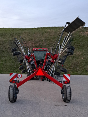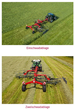 Doppelschwader / Zweikreisel - Schwader / Seitenschwader Massey Ferguson MF RK 672 SD TRC (Fella Juras 1452)Doppelschwader mit seitl. SchwadablageMehr Leistung beim Schwaden - einfache Bedienung - individuelle SchwadgrösseAnpassung an die Futtermenge durch Ein- oder Zweischwadablage möglich:- Die Ablage eines großen Einzelschwades ist ebenso möglich wie die von zwei kleinen Einzelschwaden oder eines Doppelschwades durch Gegenfahrt, perfekte Anpassung an 1., 2., und Folgeschnitte.- Arbeitsbreite ca. 5.8 (1 Schwad) - 6.7 m (2 Schwad), Umstellung mechanisch einfach möglich (auf Wunsch hydraulisch)Langlebiger FELLA-Schwaderkopf mit geschlossener Bauweise, 12 Zinkenarme/4 Zinken pro ZinkenarmKardanische Kreiselaufhängung und Tandemachse an beiden Kreiseln für saubere Recharbeit, Kreiseldurchmesser 2.78 mFolgesteuerung für Ausheben der Kreisel am FeldendeRobustes Transportfahrwerk für schnelle Feldwechsel, Bereifung 10.0/75-15.3, Zulassung 40 km/h braunExakte SteerGUARD-Lenkung, Lenkwelle ist perfekt ve, Gewicht:1580