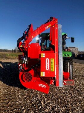 Grundausrüstung: - Für Traktoren mit 90-110 PS (Katia 650) - Dreipunkt Anbaukategorie 2 - Gewicht 880 kg (Katia 650) - Auslegerlänge 6,50 m - Integrierte eigene Ölversorgung, angetrieben über Gelenkwelle vom Schlepper - Ölkühler - Hydraulikschläuche mit Schutzmantel - Hydraulische Anfahrsicherung - Gelenkwelle - Beleuchtung - Elektrisch-proportionale Steuerung über Joystick - Auflagedruckregelung für Mulchkopf - 3-Punkt-Stabilisierung für Unterlenker - Mulchkopf, Arbeitsbreite 1,25 m mit Hammerschlegeln __________________________________________ EQUIPEMENT DE SÉRIE - pour tracteur entre 90-110 CV (Katia 650) -attelage 3 points catégorie II -poids 880 kg (Katia 650) -longueur du bras 6,50 m - système d‘huile intégré, entrainement par cardans depuis le tracteur -refroidisseur d‘huile -tuyaux hydr. avec protection -sécurité hydr. contre les chocs -cardan -éclairage - commande proportionnel par joystick - réglage de l’appui pour la tête de broyage - attelage 3 points avec stabilisation - tête de broye, Gewicht:880
