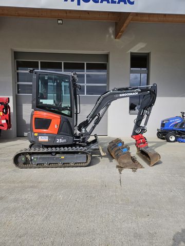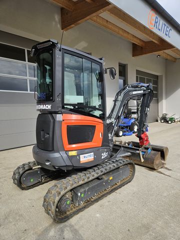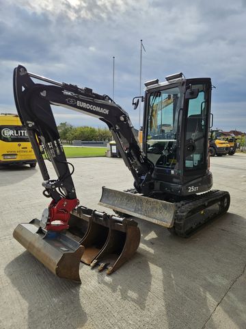 Der Eurocomach 25ZT ist ein leistungsstarker und vielseitiger Kompaktbagger. Ausgestattet mit einem YANMAR STAGE V - Tier 4 Final - Diesel Motor bietet der Bagger 15,5 kW / 21 PS und ist wassergekühlt mit einem Hubraum von 1116cc. Mit nur 200 Betriebsstunden ist dieser Bagger nahezu neuwertig und bereit für den Einsatz. Die klappbare Kabine des Baggers verfügt über ROPS/TOPS – FOPS (Niveau 1) Schutz und ist mit Heizung, Lüftung sowie einem BT-Radio ausgestattet, was für Komfort und Sicherheit während der Arbeit sorgt. Die LOAD SENSING HYDRAULIK mit FLOW SHARING Steuerblock ermöglicht präzise und effiziente Bewegungen. Der Bagger ist gemäß Norm EN 474-5 für den Umschlag von Lasten vorbereitet. Dazu gehören Lasthalteventile auf dem Hauptarm- und Stielzylinder sowie eine akustische Überlastungswarnung, die zusätzliche Sicherheit bieten. Ein Zusatzgewicht von 120 kg ist außen angebracht, was zusammen mit dem Standard-Gewicht für Stabilität sorgt, während der Hecküberstand nur 70 mm beträgt. Für bessere Sichtverhältnisse ist der Bagger mit LED-Beleuchtung vorne und hinten an der Kabine sowie am Ausleger ausgestattet, zudem schützt ein Plexiglasvordach die Kabine. Die hydraulischen Zusatzsteuerkreise sind proportionalgesteuert und bieten vielseitige Einsatzmöglichkeiten: AUX 1 für Hammer oder Greifer, AUX 2 für Powertilt, AUX 3 zum drehen von Greifern und AUX 4 für den hydraulischen Schnellwechsler. Der Bagger ist mit einem hydraulischen Schnellwechsler mit HKS Schwenkantrieb 2x90° (GEEL SW GE010 + BVD-100) ausgestattet und enthält ein umfassendes Löffelpaket. PKW- Anhängertransport möglich! Dieser Kompaktbagger ist baugleich mit dem CASE CX25D, was für seine hohe Qualität und Verlässlichkeit spricht. Suchen Sie nach einem robusten und vielseitigen Minibagger, der mit Marken wie Takeuchi, Wacker Neuson und Kubota vergleichbar ist, dann ist dieser Eurocomach Minibagger die ideale Wahl für Sie.Kontaktdaten: