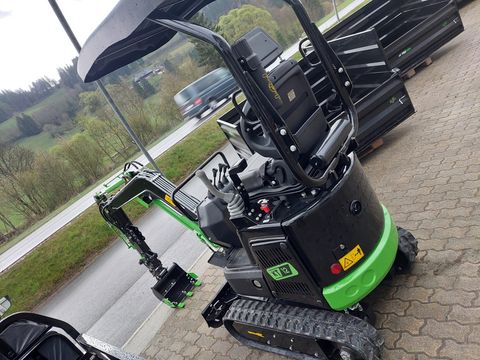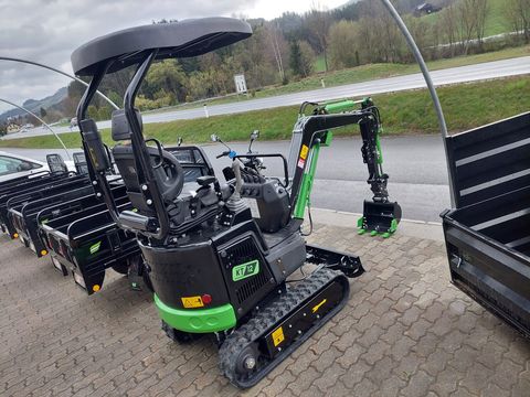 Neuer KT12 Minibagger mit 1,2 t Einsatzgewicht. Hydraulisch verstellbares Fahrwerk von 80-95 cm, mechanische Schnellkupplung und 38 cm Tieflöffel, Knickarm mit zusätzlichen Hydraulikanschlüssen, seitliche mechanische Joysticks, gefederter Sitz mit hoher Rückenlehne, Grabtiefe bis 1,6 m, Schütthöhe des Löffels ca. 2 m, Dieselmotor mit 10,5 PS, hydr. Schwenklöffel 80 cm ebenfalls auf Lager.