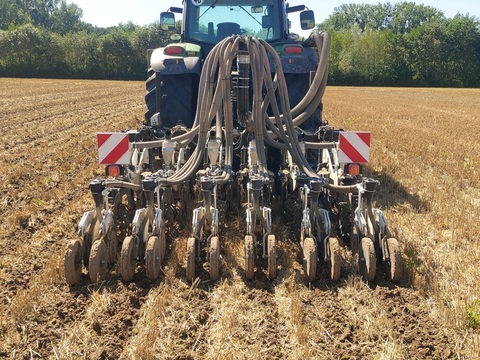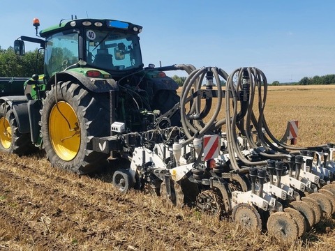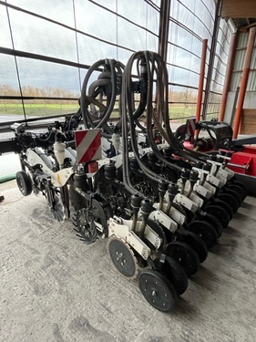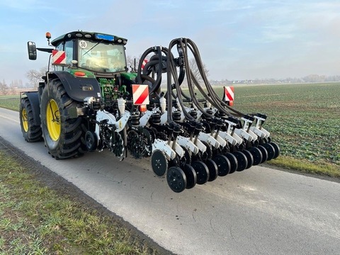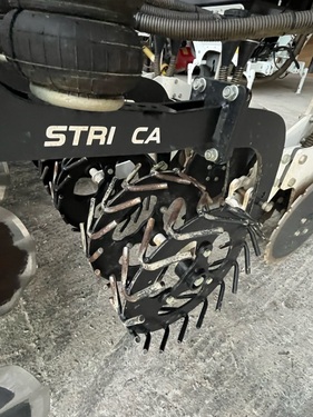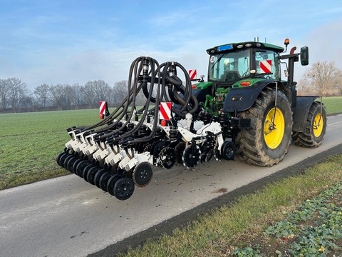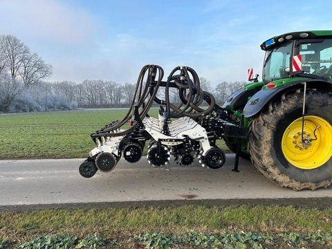 Angeboten wird eine Einzelkornsämaschinenkombination von Agrisem Fronttank DSF 1600 mit der Seriennummer: 23S1600830 (Baujahr 2023) - Sichtoptimierter 1.600 Liter Saattank mit Rollplanenabdeckung, Tank mit Teilung, Behältersieb herausnehmbar, Beladesteg vorne klappbar, 2 Dosierer aus Edelstahl und Kunststoff, Zellenraddosierung mit einzeln zu- und abschaltbaren Särädern, hydraulischer Gebläseantrieb mit 6cm³ Motor, doppleter elektrischer Säantrieb, Geschwindigkeitssignal über GPS-Antenne, ISOBUS-fähig ohne Terminal, 2 Arbeitsscheinwerfer, Beleuchtung und Warntafeln, Leergewicht 850kg, maximale Ausbringung 1600l/h, Front-Dreipunktanbau Kat. 2 StripCat II 6R50F mit der Seriennummer SC2572 (Baujahr 2024) - Strip-Till-Gerät angebaut, 3m Arbeitsbreite - 6 Reihen mit Reihenabstand 50cm, stabiler Geräterahmen, hydraulsicher Klapprahmen, 2 vordere gummierte seitliche Tiefenführungsräder, variable Druckeinstellung über Pneumatik-System, schwimmend gelagerte Räumsterne, Lockerungsmeißel mit Hartmetall-Panzerung, Säelement und Verteilerkopf Doppelreihe für 6 Reihen, Zinken für 30cm Arbeitstiefe - Sofort verfügbar und einsatzbereit!Reihenanzahl: 6