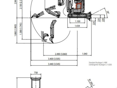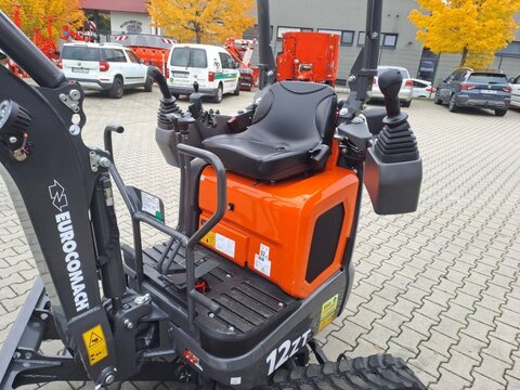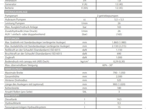 Der kleinste Bagger aus dem Hause Eurocomach Betriebsgewicht je nach Ausstattung 1200-1300 kg 11,8PS Kubota D722 Stage 5 Motor, Dreizylinder 719ccm (Verbrauch unter 2l/h) Zahnradpumpe 2-fach mit 26lt, Verstell-Kolbenpumpe gegen Aufpreis maximale Grabtiefe 1,86m, 1,98m mit verlängertem Ausleger maximale Ausladehöhe 2.13m, 2,22m mit verlängertem Ausleger Verstellfahrwerk 79cm bis 105cm, Kettenbreite 18cm Gesamthöhe 230cm, Überrollbügel abklappbar für niedriege Durchfahrten 2 Servogesteuerte Joysticks, linke Armlehne klappbar zum erleichterten Aufstieg Zusatzkreise AUX1 und AUX2 möglich Verschiedene Schnellwechsler und Löffelpakete möglich Genaue Abmessungen siehe letztes Bild Franz Zeintl 0175..2470415 Stefan Völtl 0175..3636605Kontaktdaten: