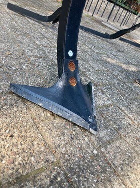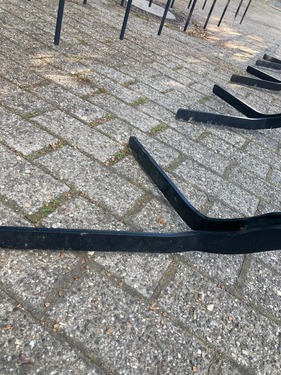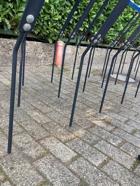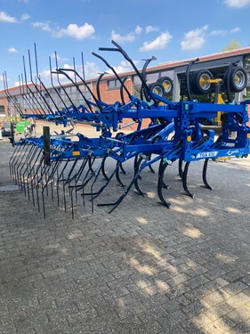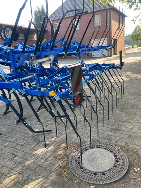 Rahmen: -Mittelteil 3 m -Seitenteile 2 x 0,65 m -Stabiler Rahmen aus Vierkantrohr 100x100 mm -3 1/2 balkiger Aufbau (ein Zinken ist zwischen den Unterlenkern angebracht, um den Seitenzug zu verhindern) -Rahmenhöhe 70 cm -Abstand Zinkenträger 70 cm -3-Punkt Anhängung: Unterlenker Kat 2/3, Oberlenker Kat.3 Klappung: -Hydraulisch klappbar 180° über Scherenklappung, die Seitenteile liegen auf dem Mittelstück auf, deshalb gibt es beim Straßentransport keine nach außenstehenden Zinken -Klappung der Seitenteile mit 2 doppeltwirkenden Zylindern, die Seitenteile sind in Arbeitsstellung hydraulisch verriegelt Zinken: -19 patentierte Zinken, gefedert über ein Blattfedersystem -Strichstabile Zinken, es ist nur ein Ausweichen nach hinten und oben möglich -Durch den ca. 1 m hohen und 25 cm vor der Scharspitze liegenden Drehpunkt wird eine Tiefenfeinregulierung nach Zugwiderstand erreicht, ohne die Arbeitsstellung der Gänsefußschare wesentlich zu verändern -Bei Überlastung (ab 1100 kg) spricht die Scherschraube an -Strichabstand 22 cm, Überlappung 8cm Zustreicher: -Gefederte Nivellierzinken (Zustreicher) -Die beiden äußeren Zustreicher sind manuell verschiebbar Bereifung Stützräder: -Die vordere Tiefenführung erfolgt durch Tandemstützräder 195/55R10C -Sie halbieren den Einfluss von Bodenunebenheiten, wie Mähdrescherspuren -Über Kurbel höhenverstellbar, mit Tiefenskala aus Edelstahl -Die Stützräder sind an den Seitenteilen montiert MAS240400 Preis gilt für vorhandenen Zustand. Angebot freibleibend. Irrtümer, Änderungen und Zwischenverkauf vorbehalten. Alle Angaben ohne Gewähr.Kontaktdaten: