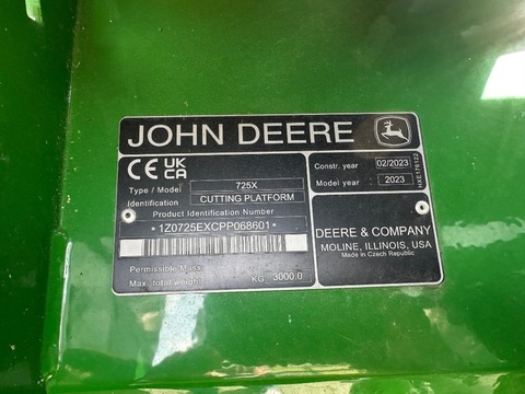 John Deere Schneidwerk 725 X Fg.-Nr. 1Z0725EXCPP068601, Rapsausrüstung, 2 mechanische Seitenmesser, 2-Achs Transportwagen gebremst, vordere und hintere Achse gelenktFg.-Nr. JD-L72, Ährenheber, SchnellkupplerKontaktdaten: