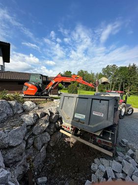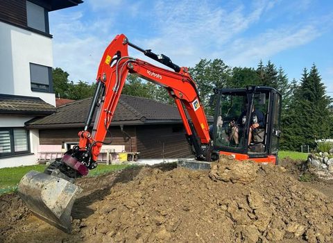 Kubota KX060-5 – Minibagger zur Miete od. auch Kauf Leistungsstark, modern & komfortabel Der Kubota KX060-5 ist die ideale Maschine für Erdarbeiten, Bauprojekte und Landschaftsgestaltung. Mit seiner kompakten Bauweise, starker Grabkraft und modernster Technik bietet er höchste Effizienz bei gleichzeitig einfachem Handling. Technische Daten im Überblick: Betriebsgewicht: ca. 5.560 kg Motor: Kubota V2607-CR-E5, 4-Zylinder Diesel, Stage V Leistung: 35,0 kW (47,6 PS) bei 2.200 U/min Max. Grabtiefe: 3.875 mm Max. Reichweite am Boden: ca. 6.120 mm Löffel-Grabkraft: 42,3 kN Fahrgeschwindigkeit: 2,8 km/h (niedrig) / 4,8 km/h (hoch) Breite: 1.960 mm Höhe: 2.550 mm Kraftstofftank: ca. 73 l Ausstattung: Komfortkabine mit Klimaanlage (abhängig vom Modell) 2 hydraulische Zusatzkreise für Anbaugeräte Auto-Shift Fahrantrieb LED-Arbeitsbeleuchtung 7″-LCD Display mit einfacher Bedienung Geräuscharmer & effizienter Betrieb Anbaugeräte: Holp Rototop. Einsatzgebiete: Erd- & Tiefbau Garten- & Landschaftsbau Bau- & Abbrucharbeiten Verladearbeiten Tagesmiete: 54,- pro Std (min. 6 Std werden pro Tag in Rechnung gestellt, Euro 324,-) Wochenmiete: 38,- pro Std (min. 36 Std werden pro Woche in Rechnung gestellt, Euro 1.368,-) Monatsmiete: 27,- pro Std (min. 90 Std werden pro Woche in Rechnung gestellt, Euro 2.430,-) Preise inkl. 20% Mwst.Kontaktdaten: