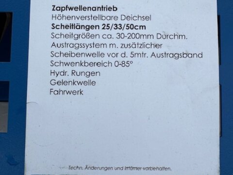 Die Boschert Scheitholzsäge Vario Cut RS 703 kann durch ein spezielle Sägeeinheit alle 2 Sekunden ein Holzscheit (1m) in bis zu vier Teile trennen. Der ergonomische Einlegebereich der Maschine beinhaltet eine Not-Stopp Funktion. Krummes Holz kann die Profimaschine im gegensatz zur Trommelsäge zuverlässig verarbeiten. Produktmerkmale: Bis zu 90 Schnitte pro Minute Scheitlängen 25 / 33 / 50 cm Eigene Bordhydraulik Maschine Sicherheit geprüft PZ.LSV Höhenverstellbare Deichsel Austragssystem mit zusätzlicher Scheibenwelle vor dem Austrags-FörderbandKontaktdaten: