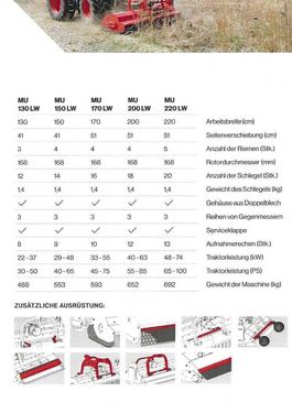 Arbeitsbreiten 130, 150, 170, 200 und 220 cm, Heckanbau, Doppeltes Gehäuse, Gegenschneide 3-fach und schraubbar, Kuven 3-fach verstellbar Optionen: Front- und Heckanbau, Hydraulische Seitenverstellung, Staubschutz, Gelenkwelle ---------------------------------------------------------------------------------------------- Schlegler, Mulcher, Schlegelhäcksler, Böschungsmäher, Seitenmulcher