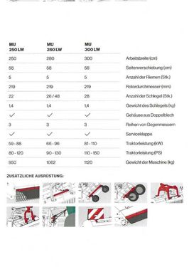 Arbeitsbreite 300 cm Heckanbau Doppeltes Gehäuse Gegenschneide 3-fach und schraubbar Optionen: Front- und Heckanbau, Hydraulische Seitenverstellung, Federentlastung, Rotor mit 48 Schlegel, Gelenkwelle --------------------------------------------------------------------------------------- Frontmulcher, Forstmulcher, Böschungsmulcher, Seitenmulcher
