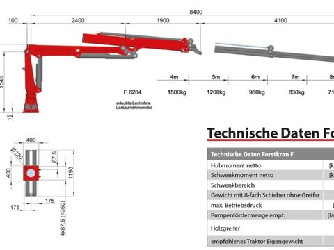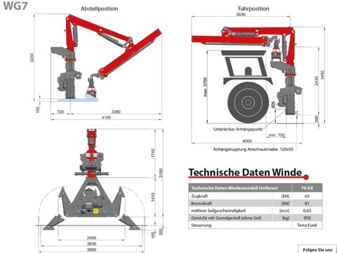 STEPA Forstkran F6284 mit Dreipunkt-Grundgestell mit integrierter UNIFOREST Getriebseseilwinde 70GX Die STEPA Produkt Neuheit 2025 überzeugt durch die einzigartige Kombination aus Forstkran mit starker Getriebewinde. Die Forstkrane sind speziell für den Einsatz per Dreipunktlösung und somit für den flexiblen Einsatz bei kompakter Bauweise konzipiert. Die große Abstützbreite sorgt für eine verbesserte Standsicherheit bei seitlichem Arbeiten. Winden, Aufarbeiten und Poltern ist somit in einem möglich - vom Stamm bis zum Gipfel! Die Krane zeichnen sich in gewohnter Weise durch ihre optimale Geometrie aus und sind mit Joystick- und Funkfernsteuerung erhältlich. Der Vorteil dieser Maschine liegt an der flexiblen Einsatzmöglichkeit und schafft es die Bäume komplett in einem Arbeitsschritt aufzuarbeiten. (Fällen-Winden-Poltern) Die wichtigste Fakten & Informationen: - Der neue Forstkran lässt sich vollständig zusammen klappen und soll daher für Fahrten über dem Traktordach transportiert werden. Bessere Gewichtsverteilung. - WICHTIG: Die Unterlenker des Traktors müssen hydraulisch gesperrt werden können. Nur 3-Punkt Lösung möglich. - Die Aufbauhöhe ist mit 300mm nahezu fixiert. Die obere Spindel kollidiert ansonsten mit der Winde. - Die Höhe des verwendeten Zuggeräts darf 2.700mm nicht überschreiten. - Die Traktoranbauteile müssen wie bei allen Dreipunktgeräten maßgenau gefertigt werden. - Im Preis inkludiert ist auch bereits die Bodenkonsole zum Abstellen des Kranes. (siehe Darstellung am Flyer) - Das Windengrundgestell wurde mit Bohrungen für die Montage einer Anhängerkupplung ausgeführt. (nicht enthalten). - Ein möglicher Anhänger darf aber nur ein sehr geringes Ausmaß annehmen, weil die Zugmaschine ansonsten vorne zu schnell hochsteigen würde. - Die Winde kann mit einem F11 oder F12 (siehe Angaben der Herstellers UNIFOREST) zu je 100m bestellt werden. - Das Produkt wird einzeln, heißt der Forstkran auf einer Kranpalette und das Windengrundgestell samt Getriebewinde mit der Bodenkonsole, ausgeliefert. Die finale Montage muss beim Händler erfolgen. HINWEIS: Der Forstkran F6284 kann auch separat für Fremdaufbauten verkauft werden. Lieferzeit momentan ca. 4 Monate. Bei Fragen können Sie uns jederzeit kontaktieren.Kontaktdaten: