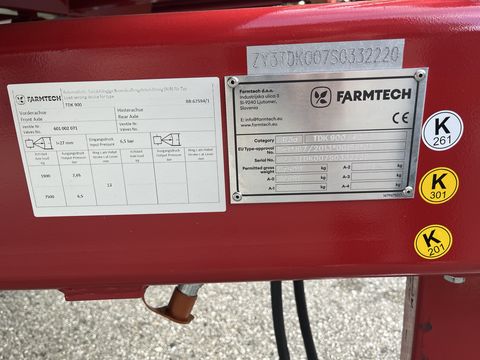 Farmtech TDK 900 Bereifung: 355/60 R18 Mitas Nutzlast: 6700kg Stützlast: 1500kg Leistungsbedarf: >54PS/41kW -2-Leitung Druckluftbremsanlage mit ALB -Handbremse -Tandemaggregat -Fixachse -Sattelstützwinde -BordwandhebefederZul. Gesamtgewicht (t): 7,5