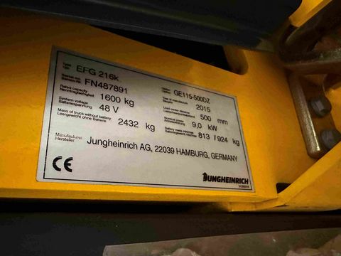 JUNGHEINRICH Elektrostapler EFG 216k Baujahr: 2015 10851 Betriebsstunden laut Zähler Tragkraft: 1600 kg Hubmast: TRIPLEX-Freihub Hubhöhe: 5000 mm Bauhöhe: 2235 mm Freihub: 1645 mm Bereifung: Super-Elastik - Seitenschieber - Batterie 48 V / 625 Ah - Ladegerät - Arbeitsscheinwerfer vorne u. hinten - Safety Light vorne u. hinten - Lastschutzgitter GUTER ZUSTAND !!! Für etwaige Rückfragen steht Ihnen Herr Thomas Lehner natürlich gerne zur Verfügung !Kontaktdaten: