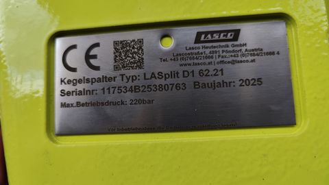 LASCO Kegelspalter LASplit D1 62.21 - Kegeldurchmesser: 210mm - Trägerfahrzeug: 1,3 - 5,0 t - Motorentyp 62 - Ölmenge: 30 - 80 l/min - max. Öldruck: 170 - 220 bar - ca. 90kg - Holzdurchmesser bis 90cm - inkl. Kontraplatte und Schrauben Preis ohne Aufnahme und ohne HydraulikschläucheEigengewicht (kg): 90