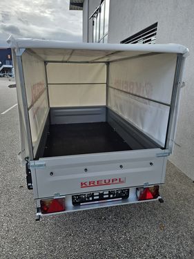 GG: 750 kg, NL: ca. 640 kg, EG: ca. 116 kg (ohne Zubehör) Lademaße: 2020 x 1070 x 345 mm, Bereifung: 13“ 3 feuerverzinkte Längsträger, Kunststoff-Kotflügel Knott-Gummifederachse mit Einzelradaufhängung 9 mm starker mehrlagig wasserfest verleimter Holzboden mit rutschhemmender Siebdruckoberfläche Bordwände aus Stahlblech 1 mm mit Aluminium-Zinkbeschichtung 4 Stk. Zurrhaken montiert, Stecker 13-polig Stützrad mit Halter, Hochplane 800 mm "KREUPL" Inkl. TypenscheinZul. Gesamtgewicht (t): 0,75