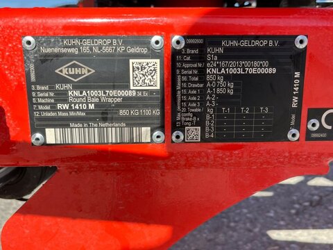 RW 1410M Linkes Rad außen montiert Bereifung 10.00/80-12 E-Twin Folienvorstrecker Unterlenkeranbau m.Schwenkkopf Unterlegkeile Satz Beleuchtung Info Zulassung EU 40 Magazin für 4 Folienrollen Manuelle Bedienung Sicherungskette Montage-Anl. RW 1410 Main Statutory Plate CE Plate EU Format Homol. Plate + Holes COC Cert of Conf. Road UE Konformitätserklärung. KuhnKontaktdaten: