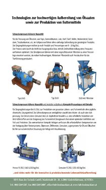 Wir bieten Schneckenpressen kleinerer und mittlerer Kapazität für die Pressung von Ölsaaten, wie Raps, Sonnenblumen, Lein, Hanf, Senf, Mohn, Mariendistel, Sanddorn, Traubenkernen, etc. im Kaltpressverfahren ohne vorherige Behandlung der Produkte. Die Eingangsleistungen reichen je nach Produkt und Pressentype von 8 – 24 kg/Std. Der Prozess wird durch die Wahl der Ausgangsdüse bzw. mittels Drehzahleinstellung eines Frequenzumformers optimiert. Die Einzelpressen können mit einer angeschlossenen Filtration zu einer Pressanlage erweitert werden, die neben hochwertigem, filtriertem Pflanzenöl auch Presskuchen für die Tierfütterung produziert.Kontaktdaten: