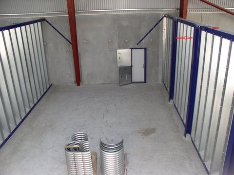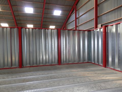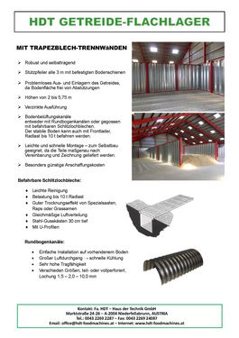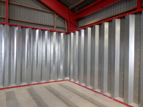 Neue verzinkte Trapezblechwände (senkrechte Ausführung) zur Innenaufstellung in Hallen, robuste und selbsttragende Konstruktion, Höhe 2,0 - 5,75 m. Stützpfeiler alle 3 m oder Verspannungen/Gewindestangen der oberen U-Schienen, mit befestigten Bodenschienen. Eine reibungslose Ein- und Auslagerung von Schüttgütern aller Art wird gewährleistet, da die Bodenfläche frei von Abstützungen bleibt. Bei Bedarf liefern wir auch Einstiegstüren mit Befüll-Luke, Belüftungsböden (befahrbare Schlitzlochbleche bis 10 t Radlast oder Rundbogenkanäle) und sämtliche Zusatzausrüstungen zur Belüftung, wie Ventilatoren, etc..Die Wände sind einfach in Selbstmontage zu installieren, da die Teile nach Maß zugeschnitten und geliefert werden.Fassungsvermögen (t): 999