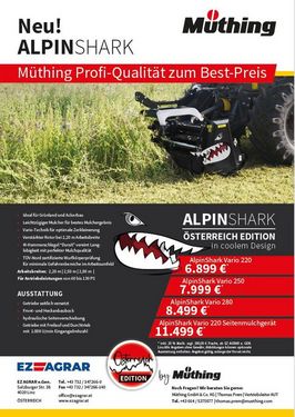 * Ideal für Grünland und Ackerbau * Leichtzügiger Mulcher für bestes Mulchergebnis * Vario-Technik für optimale Zerkleinerung * Verstärkter Rotor bei 2,20m Arbeitsbreite * H-Hammerschlägel "DuraX" vereint Langlebigkeit mit perfekter Mulchqualität * TÜV-Nord zertifizierte Wurfkörperprüfung für minimale Gefahrenbereiche im Arbeitsumfeld Arbeitsbreiten 2,20m / 2,50m / 2,80m Für Antreibsleistungen von 60 bis 130 PS + Getriebe seitlich versetzt + Front- und Heckanbau + Hydraulische Seitenverschiebung + Getriebe mit Freilauf und Durchtrieb mit 1.000 U/min Eingangsdrehzahl AlpinShark Vario 220 - Aktionspreis 6.899,- € AlpinShark Vario 250 - Aktionspreis 7.999,- € AlpinShark Vario 280 - Aktionspreis 8.499,- € TOP Qualität zum TOP Preis! Aktionspreise inkl. 20% MWSt., zuzüglich 180,-€ Fracht Angebot gültig, solange der Vorrat reicht.Kontaktdaten:
