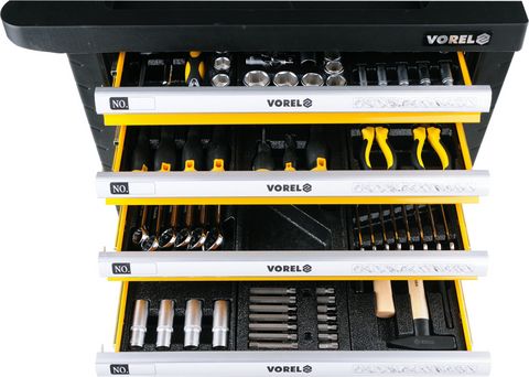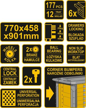 Werkzeugwagen mit 177 Teilen, Stahlrohrrahmen Lochwand für Wagenzubehör vollwertige ABS-Arbeitsfläche mit Ablagen 57 Kg, Laden komplett ausziehbar, 4 gefüllte Schubladen / 2 Schubladen, Zentralschloss mit 2 Schlüsseln, große gummierte Räder, hochwertige QualitätKontaktdaten: