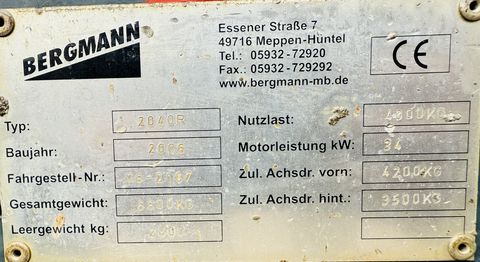 Dumper Bergmann 2040R, Erstbesitz, Baujahr 2006, 34 Kw 4 Zylinder Kubota, 4.750 Stunden, Nutzlast 4 to, breite Reifen (geschäumt), Allrad, Hydrostat mit 2 Stufen, drehbare Mulde, großer Ölkühler, starke doppelwirkende Zylinder bei der Mulde. Preis: € 10.800,- inkl. Mwst. DG-Handel