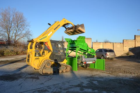 Vibrationssiebanlage für 2 Fraktionen Sieb Maschine ganz einfach klappbar für einfachen Transport. Effektive Abschiebung von 99 % aller losen Materialien Absiebung von 0,5-100 mm möglich, durch einfach austauschbare Siebdecks. Transport dank Kompaktheit auf PKW-Anhänger möglich. Flexibler Einsatz der Maschine durch leicht austauschbare Siebdecks. Siebfläche 1.800 x 900 mm. Gewicht der Maschine 580 kg.Kontaktdaten: