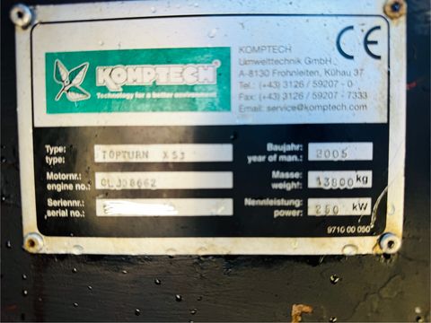 Kompostwender Komptech Topturn X53, Erstbesitz aus österreichischen Staatsbetrieb, Baujahr 2005, Arbeitsbreite 5 m, Kettenlaufwerk, Schutzbelüftung, vollständige Ausrüstung für Seitenversetzer, Klima, zusätzliche Stiege für einfachen Aufstieg, Motor CAT C9 DPF, Nachgerüstet für eine bessere Abgasstufe, LED Arbeitsbeleuchtung, Motorhaube per Elektroaggregat zum Öffnen, Kabine vollständig hydraulisch am Boden zu senken, für bequemes einsteigen, Maschine hat ein großes Service bekommen (sämtliche Öle sowie Filter), dabei wurden auch fast alle Hydraulikschläuche gewechselt, Laufwerk vor wenigen Stunden neu (alle Laufrollen und Kettenbänder), Walze wurde ebenfalls vor weinigen Stunden aufgepanzert und ausgewuchtet (aktuell ~ 80%), Polyamid Verschleißplatten neu, sämtliche abgenutzte Teile wurden sandgestrahlt und neu beschichtet, dabei wurden auch mangelnde Bolzen ausgetauscht, Steuerplatiene NEU, weiters wurde die Maschine von einem Komptech Techniker durchgecheckt, sämtliche Ersatzteillisten sowie Hydraulik u. Elektroschaltpläne vorhanden. Auf Wunsch haben wir noch den passenden Umsetzer dazu. Transport sowie Einschulung europaweit möglich!!! DG-Handel