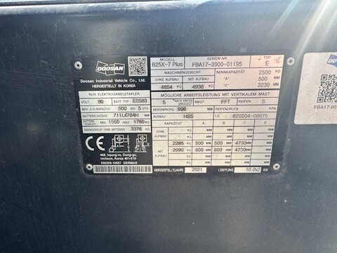 Bauart: Frontstapler / Elektro 4 Rad-Stapler, Tragkraft: 2500kg, Hubhöhe: 4730mm, Bauhöhe: 2160mm, Gabellänge: 1200mm, Batterie: TAB Bj. 2022 80V 100Ah Zustand: 80 - 100%, Bereifung vorne: Superelastik Einfach 80 - 100% , Bereifung hinten: Superelastik Single 80 - 100% , Sonderausstattung: 4. Ventil, Arbeitsscheinwerfer vorn, Dachabdeckung, Frontscheibe, CE Zertifikat,