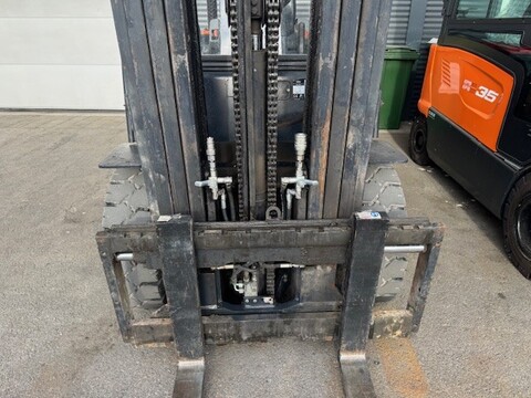 Bauart: Frontstapler / Dieselstapler, Tragkraft: 3000kg, Hubhöhe: 4730mm, Bauhöhe: 2165mm, Gabellänge: 1200mm, Bereifung vorne: Superelastik , Bereifung hinten: Superelastik , Anbaugeräte: Seitenschieber, Sonderausstattung: 3. Ventil, Arbeitsscheinwerfer vorn, Dachabdeckung, Frontscheibe, Vollfreihub, Sonderausstattungbeschreibung: 4.Hydraulikfunktion mit Schnellkupplung und Kugelhahn