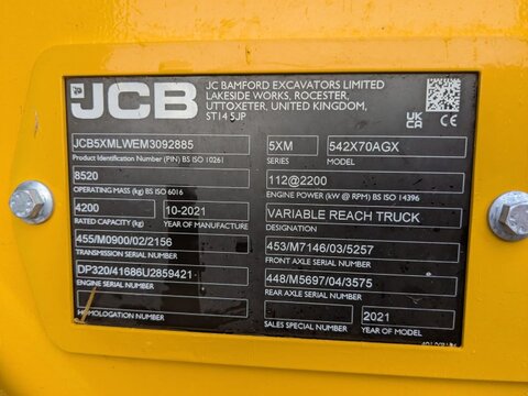 542-70 Agri Xtra, 112kW/150PS, Dual Tec VT Getriebe, 40km/h,EU-Stufe V, T1A, Serie IIIJCB DieselMax Stufe V (112kW), 4,8 Liter, 600 Nm, man. Klimaanlage, auto. Umkehrlüfter, auto. SRS, LSD Achse, Dual Tec VT, 40km/h, auto. Allradabschaltung, Power Breaks, man. Rockinger AHK (31,5mm Bolzen) mit Spiegel und hydraulischer Zweileitungsbremse und Elektrik, 3 Lenkmodi (Allradlenkung, Vorderachslenkung, Hundegang) mit auto. Lenkausrichtung, Smart Hydraulik Paket: 140l/min Load Sensing Pumpe mit Smart Hydraullik für Auslegerabsenkung, Einteleskopieren, Schauffel-Rüttelmodus, Druckentlastung innen und außen an der Kabine für Zusatzsteuerkreis, Endlagendämpfung für Ausleger, zentrale Schmierleiste, Schmutzabstreifer, Unterfahrschutz, Lastmomentanzeige mit Überlastabschaltung gemäß EN15000, Live Link Telematik System, Beleuchtungs-, Spiegel- und Warnanlage gemäß STVZO, 11x LED Scheinwerfer:4x Front, 2x Heck, 2x Heck Chassis, 2x Ausleger, 1x AHK, T1A Traktorhomologation, EN1459-1Kontaktdaten: