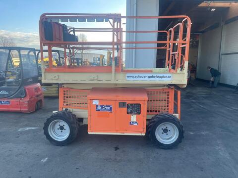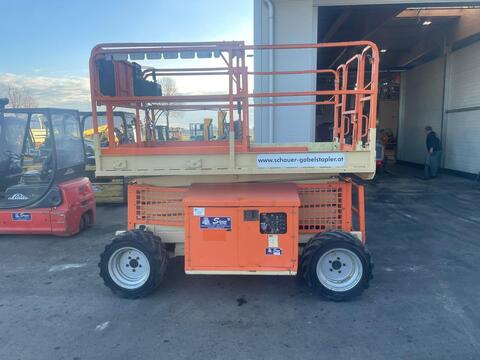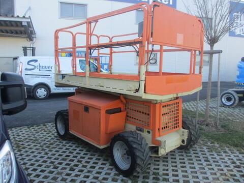 Bauart: Arbeitsbühnen / Scherenarbeitsbühne, Sonderausstattungbeschreibung: • Arbeitshöhe 9.92 m A. Plattformhöhe – ausgefahren 7.92 m B. Plattformhöhe – eingefahren 1.26 m C. Plattform – Geländerhöhe 1.10 m D. Durchfahrtshöhe 1.47 m (Geländer heruntergeklappt) E. Plattformgröße 1.65 m x 2.59 m F. Plattformausschub 1.22 m G. Gesamtbreite 1.75 m H. Gesamtlänge 1 2.67 m I. Radstand 1.98 m J. Bodenabstand 0.20 m • Plattformtragfähigkeit- Uneingeschränkt 570 kg • Tragfähigkeit der ausschiebbaren Plattform 140 kg (Option) • Hebe-/Senkzeit 37/24 sec. • Maximale Fahrhöhe 7.92 m • Maschinengewicht 2 3,390 kg • Max. Bodendruck 8.30 kg/cm2 • Fahrgeschwindigkeit 5.6 km/h • Steigfähigkeit 35% • Wenderadius: innen 2.13 m / außen 4.39 m