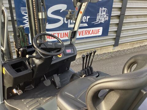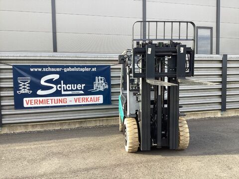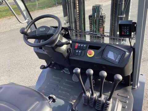 Bauart: Frontstapler / Elektro 4 Rad-Stapler, Tragkraft: 3500kg, Hubhöhe: 4650mm, Bauhöhe: 2212mm, Freihub: 1615mm, Gabellänge: 1200mm, Batterie: 80V 600Ah Zustand: Neu, Bereifung vorne: Superelastik , Bereifung hinten: Superelastik , Anbaugeräte: Seitenschieber, Anbaugerätebeschreibung: Vorgehängter Seitenschieber 3-3,5t 1100mm Sonderausstattung: Halbkabine, Sonderausstattungbeschreibung: Komfortsitz + ISO Sicherheitsventil 3691 Dachscheibe Glas USB Ladegerät Panormaspiegel Warnleuchte: Blitzleuchte unter dem Dach, geschützt Arbeitsscheinwerfer hinten: LED-Ausführung am Schutzdach oben rechts, geschützt Beleuchtungsanlage: LED-Ausführung vorn: 2 geschützte LED-Scheinwerfer mit Fahrtrichtungsanzeiger hinten: LED-Schluss- und Bremsleuchten, Fahrtrichtungsanzeiger, Warnblinkanlage Arbeitsscheinwerfer vorn: LED am Schutzdach, oben links und rechts, geschützt Warneinrichtung: akustischer Signalgeber Warnzonenleuchten: Safety Zone Light. Seitliche Warnlichter projezieren blaue Lichtbalken links und rechts neben dem Fahrzeug auf den Fußboden und warnen somit Passanten. Fahrsteuerung: Geschwindigkeitsreduzierung bei angehobenem Gabelträger (500mm) Geschwindigkeitsassistent: Durch die lenkwinkelabhängige Geschwindigkeitsbegrenzung wird möglicher Warenbruch durch angemessene Kurvengeschwindigkeit reduziert. Beschreibung: Hubgerüst: VFHM 4650 Gabelträger: 6 Rollen 1100 mm breit, ISO 3A Gabelzinken: Länge 1200 mm, Querschnitt 150x50 mm, ISO 3A Zusatzhydraulik: doppelt für VFHM-Hubgerüst Hydraulikbetätigung: Mehrhebelbedienung, 4 individuelle Hebel für Heben, Neigen und Zusatzhydrauliken rechts neben dem Sitz, mit Klammerfreigabe am vierten Hebel Verschleißschutz der Gabel: Gabelverschleißschutz, mechanisch Lastschutzgitter: Form A 1000mm hoch für Gabelträger 1040 mm Hydraulische Anlage: Mehrbereichs-Universal-Hydrauliköl für Temperaturen von -20/+40 Grad Hydraulikspeicher: im Hubkreislauf