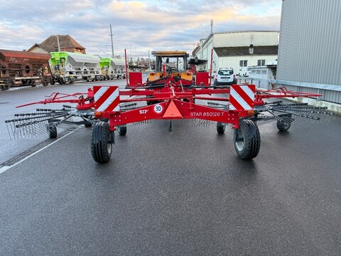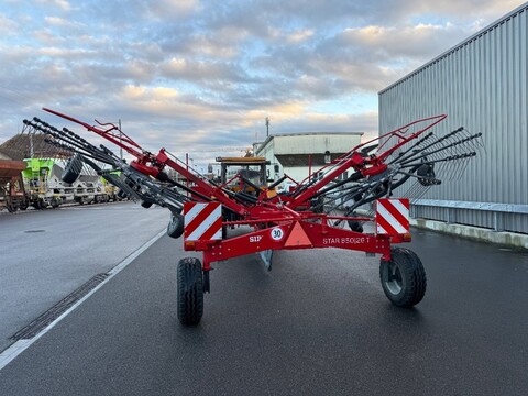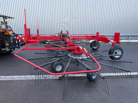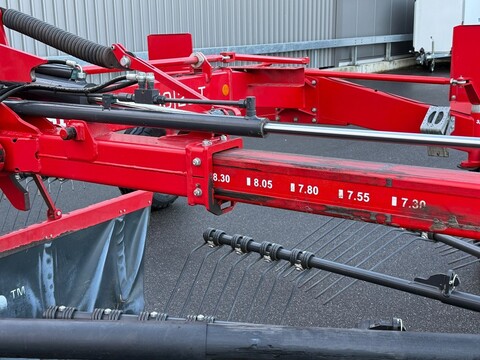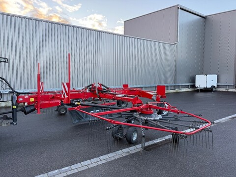 Doppel-Kreiselschwader mit Mittelablage13 Zinkenträger à 4 Doppelzinken, Einkreiselbedienung mit Umschalthahnen, gelenkter Fahrrahmen breit, 4-Rad Fahrwerk mit Bereifung 16x6.5 - 8", Bereifung Fahrwerk 10.0/75-15.3, Gelenkwelle, Warntafeln und BeleuchtungArbeitsbreite 7.30 - 8.30m hydr. verstellbar, Transportbreite 2.95m brunes Nummerschild, Transporthöhe 4mAb Kontrolle, Betriebsbereit, Gewicht:2070, Seriennummer:230
