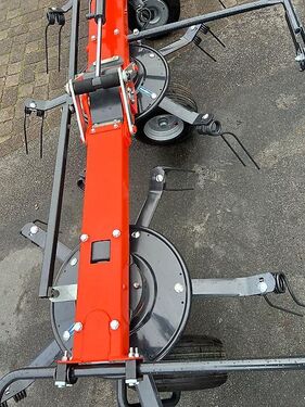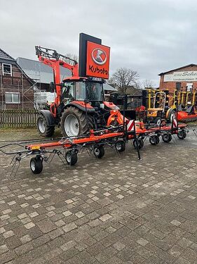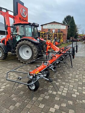 Heuwender Kubota TE8080 (baugleich mit Vicon Fanex 804) Inklusive 2 Jahren Gewährleistung Neumaschine Baujahr: 2024 Arbeitsbreite: 8,05 m Transportbreite: 2,85 m Abstellhöhe: 3,15 m Kreisel / Zinkenarme: 8/5 Gewicht: 950 kg Zapfwellendrehzahl: 540 U/min benötigte Hydraulik: 1 x dw mechanische Grenzstreueinrichtung ProLine Schwingungsdämpfer Wickelschutztöpfe Gelenkwelle mit Rutschkupplung Wartungsarme CompactLine Getriebe: nur ein Schmiernippel pro Einheit kastenförmiger Profilrahmen - Kreiselgetriebe nicht in die Trageinheit integriert Super-C-Zinken, 4 Windungen, Drahtstärke 9 mm Finanzierung über 2 Jahre zu 0,49% Zinsen möglich Optional erhältlich: Stützrad vorne, hydraulische Grenzstreueinrichtung, Nachtschwadgetriebe, ähnlich Krone Vendro, Claas Volto, Kuhn GF, Vicon Fanex Alfred Scheidel Landmaschinen GmbH & Co.KG