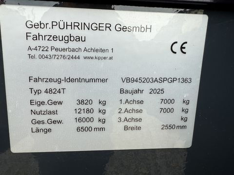 Neuer PÜHRINGER 4824Tandem 16t Gesamtgewicht - BAUKIPPER mit super Ausstattung: * gewerbliche Typisierung / 40 km/h * Grundbordwand 600mm * OHNE Aufsatzbordwand * Bereifung 445/45x19,5 * niedrige Bauweise * hydraulischer Stützfuß * Untenanhängung + verlängerte Flanschplatte * K80 Anhängerkuppung * Hardoxboden * Hardoxwände 600mm * LKW Verschlüsse und verstärkte Ecksteher * Heckwand hydraulisch * Beleuchtunsschutz hinten * 6 Stück Zurhaken 3,15t * Werkzeugkasten PVC (630/450/480) * Wände in schwarzZul. Gesamtgewicht (t): 16