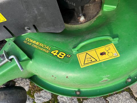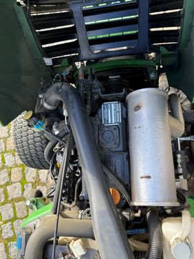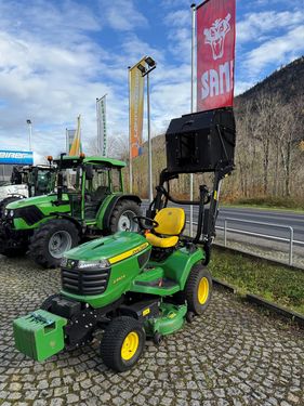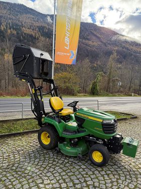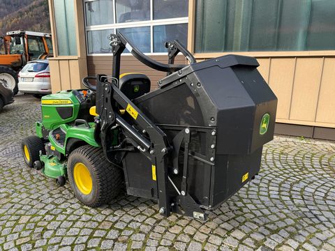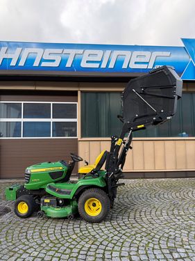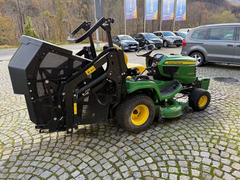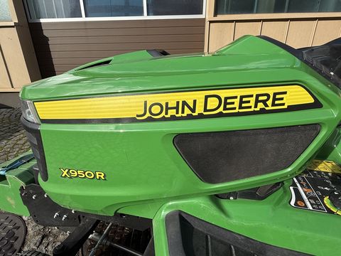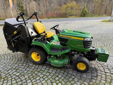 Sehr schöner John Deere X 950R Rasentraktor mit Hinterradantrieb, 125cm breites Mittelachsmähwerk mit Grasfangkorb und Hochentleerung (Hubhöhe / Unterkante: 196cm). 3-Zylinder Dieselmotor mit Wasserkühlung.Bereifung vorne: 18-8,50x8
