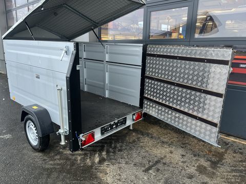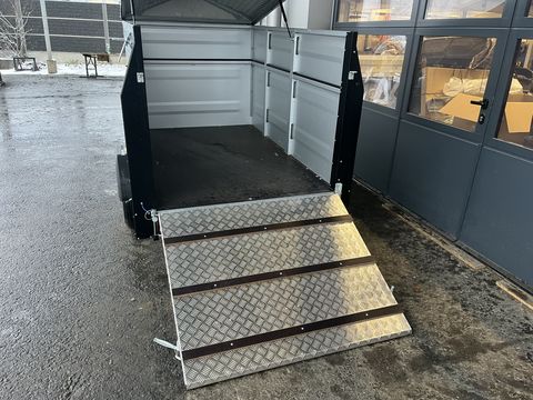 Kleinviehtransporter TPV EU 2/3 -Hintertür: Flügeltürkombination -Gesamtgewicht: 750kg -Nutzlast: 460kg - Kasteninnenmaße: L/B/H: 2.020 x 1.075 x 1.020 mm Aufbau & Ausstattung: - Schwenktür-Rampenkombination mit Alu-Riffelblech und Trittleisten auf Rampe - Planengestell mit Plane (grau, Gasdruckfedern, Lüftungsklappe) - Schiebestützen hinten - 9 mm starker mehrlagig wasserfest verleimter Holzboden mit rutschhemmender Siebdruckoberfläche - 3 feuerverzinkte Längsträger - Stahlblech-Bordwände mit Alu-Zinkbeschichtung - 13-poliger Stecker - absperrbare Anhängerkupplung - KunststoffkotflügelZul. Gesamtgewicht (kg): 750