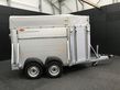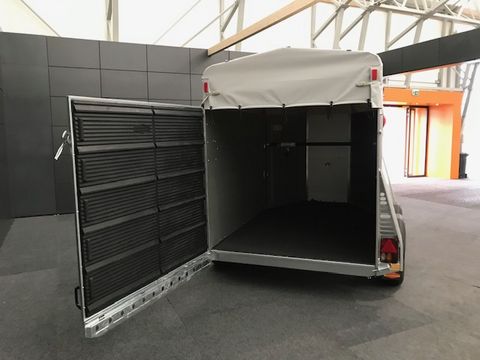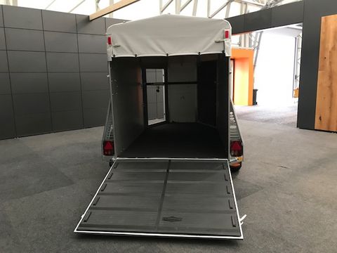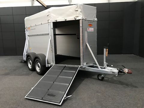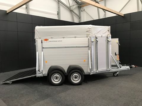 Viehanhänger Böckmann Vollalu VA 3016/27 - CFF-Fahrgestell (Comfort-Federungs-Fahrgestell) - Seitenwände 1,50m hoch, Alu-elox. - Aluminiumboden - Plane und Spriegel, Planenfarbe grau - 4 Hinterklappen-Scharniere - Hebevorrichtung - Rollen an Hinterklappe - Einstiegstür rechts mit 2 Winkelhebelverschlüssen - Gummi auf Beladeklappe (integrierte Trittleisten) - Innenbeleuchtung - Lichtanlage mit Rückfahrscheinwerfer und Stecker 13-polig - Stellfläche ca. 5m², Gesamtgewicht 2.700kg - Innenmaße: LxBxH 3050 x 1650 x 2020mm - dreh- und schwenkbare Hecktüre - Entladeklappe rechts mit Gummibelag (Tür links) Das Verkaufsteam der Fa. Mühlbacher Machinen zeigt Ihnen gerne den gewünschten Anhänger und bittet um Terminabsprache zwecks Besichtigung bei uns im Betrieb. Besuchen Sie auch unsere 1.500m² große Ausstellungshalle!Zul. Gesamtgewicht (t): 2,7