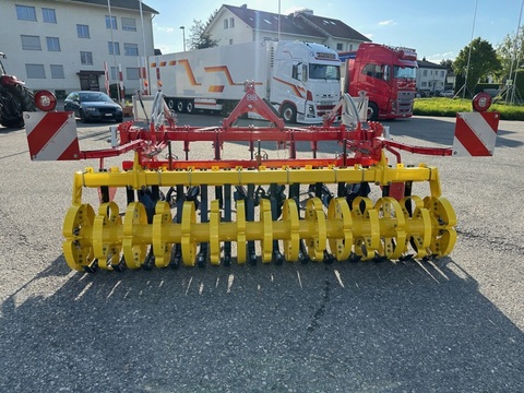 2 balkige Ausführung mit 7 Zinken, demontierbare Flügelschare, Schraubensicherung, Dreipunktanbau Kat.2, 6 gezackte Nivelierscheiben geführt über Nachläufer, Nachläufer Conoroll 540mm, Randblech Links und Rechts, Kraftbedarf 90-170PS, Arbeitstiefe 6-20cm, Arbeitsbreite 3m, Gewicht inkl. Nachläufer ca. 1'345kgInkl. Warntafeln und Beleuchtung, Gewicht:1345